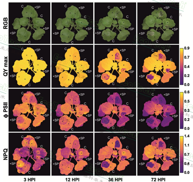 于是,研究人员利用PlantScreen系统中的RGB可见光形态成像与叶绿素荧光成像功能,对瞬时表达 HpSSP35.8 的本氏烟叶片进行了动态监测。结果表明,利用可见光成像的色彩分析要到36小时才能看到明显的坏死症状。而叶绿素荧光参数ΦPSII(PSII实际光化学效率)在接种后3小时就开始显著下降;QYmax(PSII最大光化学效率)则在9小时后出现差异,从而证明叶绿素荧光参数及成像分析是比形态、色彩观察更灵敏、更早期的细胞死亡和生理胁迫指示器,可用于高效筛选其他潜在的效应子蛋白。