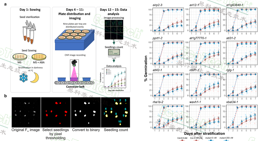 左图:高通量叶绿素荧光成像分析工作流程;a.播种、放置样品、成像测量、图像分析;b.最大叶绿素荧光Fm成像图的分析过程;右图:不同处理的发芽率动态曲线
