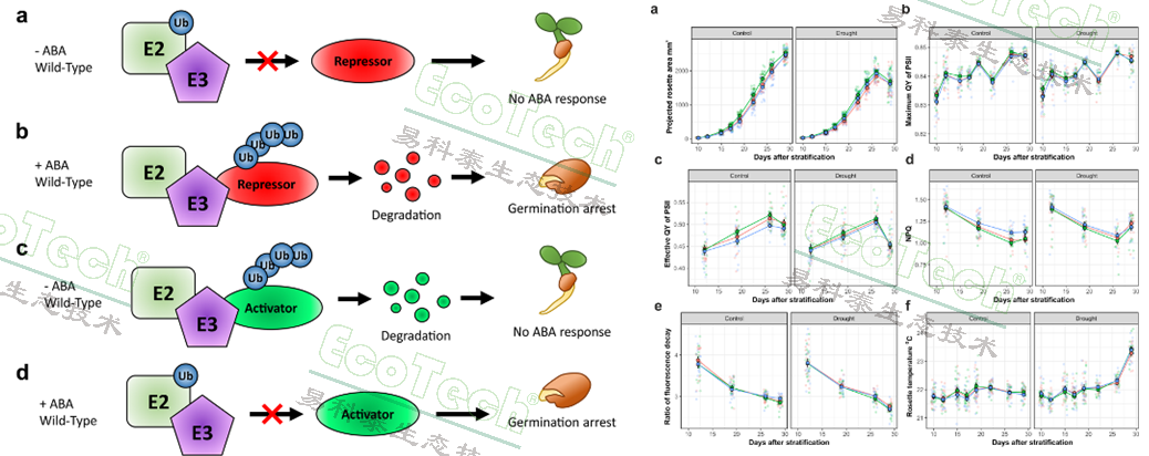 左:泛素E3连接酶在ABA反应途径中的功能假说;右:对应处理的冠层投影面积、各项叶绿素荧光参数、冠层温度的动态曲线