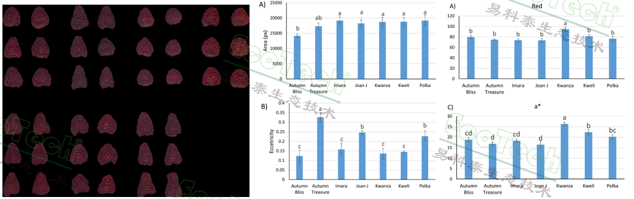 左图:经过背景去除的树莓果实RGB成像图;中图:树莓果实的形态数据:面积和偏心率;右图:树莓果实的颜色数据:平均红度和CIE数值