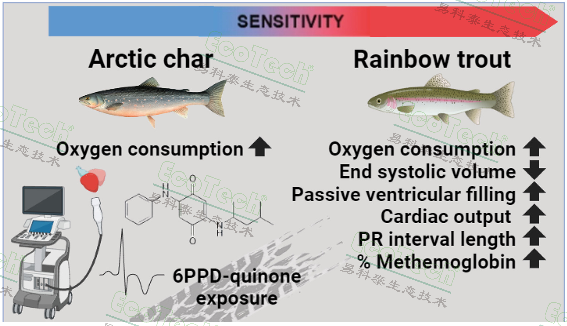 本研究聚焦于橡胶轮胎抗氧化剂环境转化产物6PPD-醌对两种鲑鱼的急性心肺毒性:以敏感物种虹鳟(Oncorhynchus mykiss)和耐受物种北极红点鲑(Salvelinus alpinus)为研究对象,通过48小时的暴露实验,结合呼吸测量法、心脏超声、心电图和血气分析等技术,探究其亚致死浓度下的心血管和代谢效应。研究设置了对应物种的6PPD-醌暴露浓度(虹鳟0.59 μg/L、北极红点鲑7.15 μg/L)与溶剂对照组,发现两种鲑鱼的标准代谢率(SMR)均出现显著变化,而虹鳟还表现出收缩末期容积降低、心室被动充盈增加、心输出量上升、PR间期延长等心脏刺激特征,且高铁血红蛋白显著升高导致组织氧合能力受损,北极红点鲑则未出现心血管功能的明显异常。研究结论表明,6PPD-醌对鲑鱼存在物种特异性毒性,虹鳟的心肺症状是代谢紊乱引发的继发性心血管代偿反应,而非直接心脏毒性,北极红点鲑因更高效的解毒代谢通路展现出耐受性,同时该研究也证实了6PPD-醌亚致死效应对鲑鱼种群生存的潜在影响。