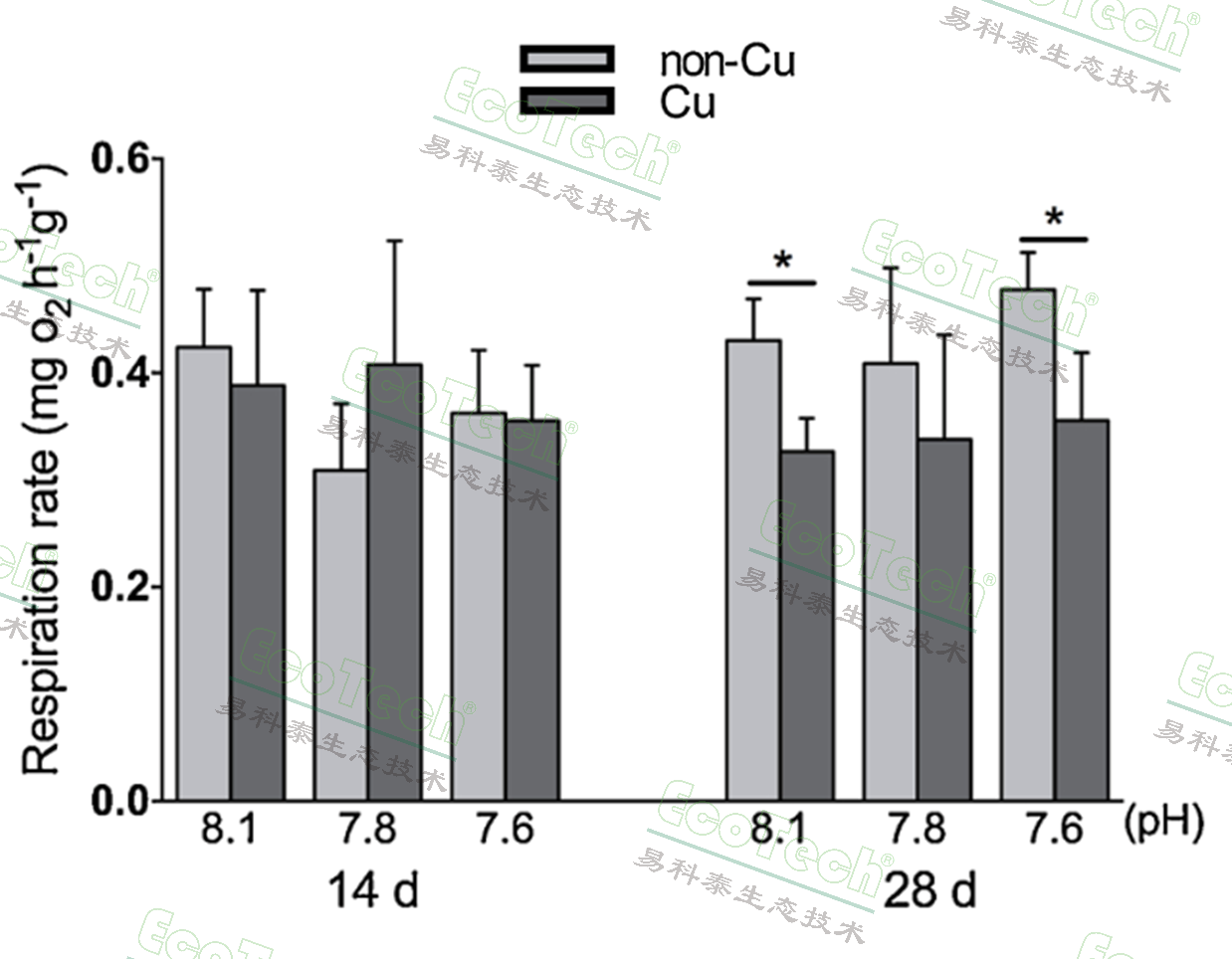 自动间歇式呼吸测定系统在本研究中是测定牡蛎呼吸速率(Respiration rate,RR)的重要工具,为探究酸化与铜暴露对牡蛎能量代谢的影响提供了关键生理数据。该系统通过玻璃呼吸室、光纤氧传感器及配套软件,对不同处理组牡蛎的耗氧情况进行精准测定,先经冲洗、稳定、测定三个阶段采集溶氧变化数据,再通过公式计算得到单位干重牡蛎每小时的耗氧量(mg O₂ g DW⁻¹ h⁻¹)。研究借助该系统发现28天铜暴露在pH8.1和pH7.6条件下会显著抑制牡蛎的呼吸速率,而海水酸化与铜的联合作用进一步加剧了这一抑制效应。这些呼吸速率数据与牡蛎的清滤率、肥满度、糖酵解酶活性等数据相互印证,清晰揭示出牡蛎因呼吸速率降低出现有氧代谢受抑,进而启动无氧糖酵解补偿能量需求的代谢响应,同时证明这种代谢调整伴随能量获取减少、机体健康下降,直接支撑了“酸化与铜联合暴露引发牡蛎能量代谢紊乱,且该能量策略长期不可持续”的关键结论。