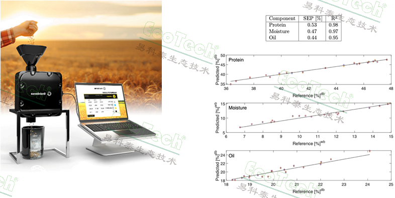 右图:大豆蛋白质、水分、脂肪含量预测值与真实值比对