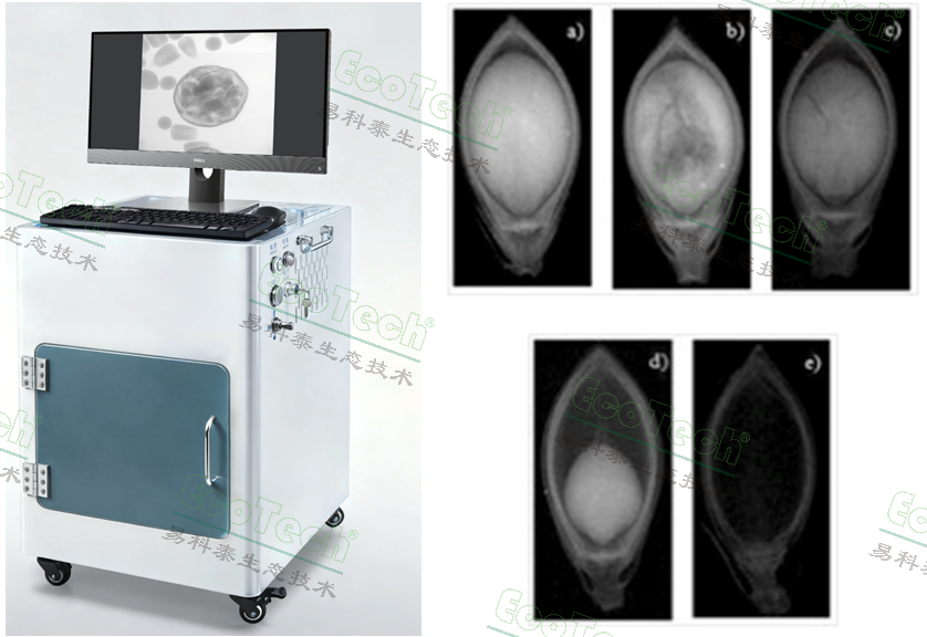 右图:经X射线成像检测的信号草(一种牧草)种子:完整种子(a)、组织退化(b)、机械损伤(c)、畸形(d)及空壳颖(e)