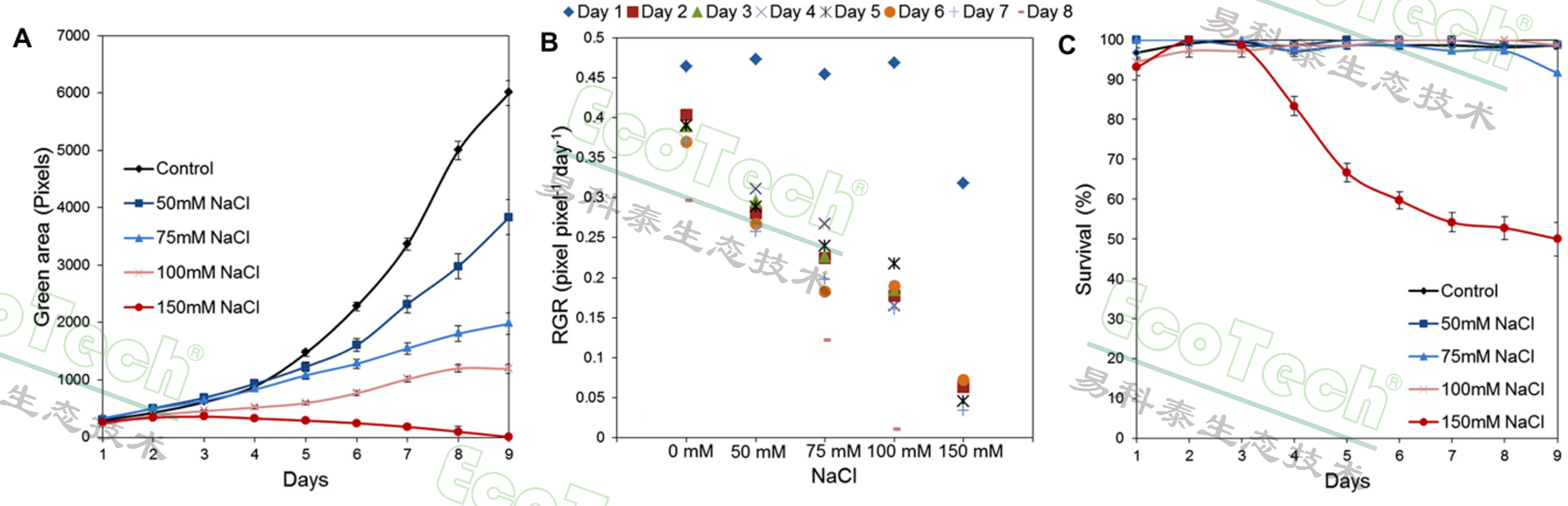 捷克帕拉茨基大学(Palacký University Olomouc)是较早使用高通量表型成像技术进行种质资源活力评估的科研单位之一。研究人员使用一套PlantScreen XYZ三维扫描植物表型成像分析系统在严格控制培养条件的情况下,对多孔板上萌发的拟南芥幼苗进行不同浓度的盐胁迫处理,同时进行连续RGB成像,考察其在9天生长过程中的形态变化。