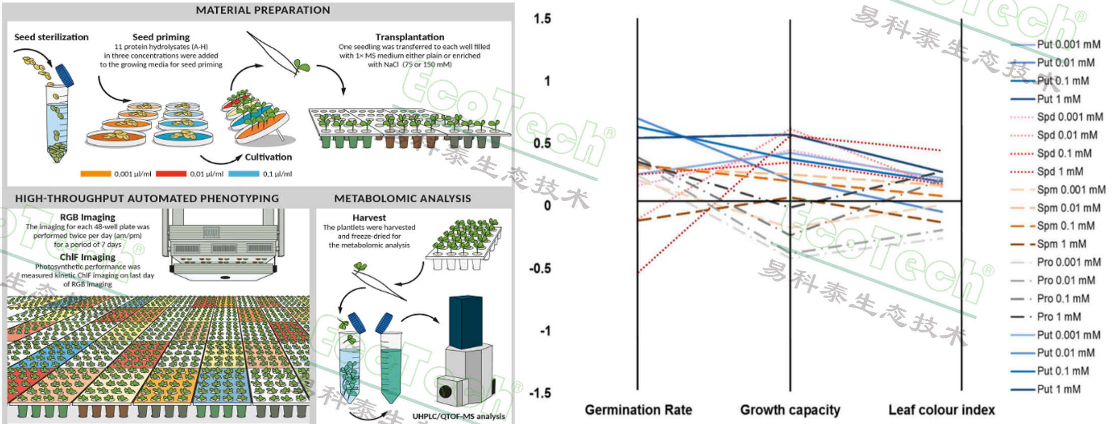 左:利用PlantScreen XYZ植物表型成像分析平台的拟南芥种子活力实验示意图;右:重度盐胁迫下各种生物刺激素对拟南芥种子萌发率、种苗生长能力、叶片颜色指数的影响