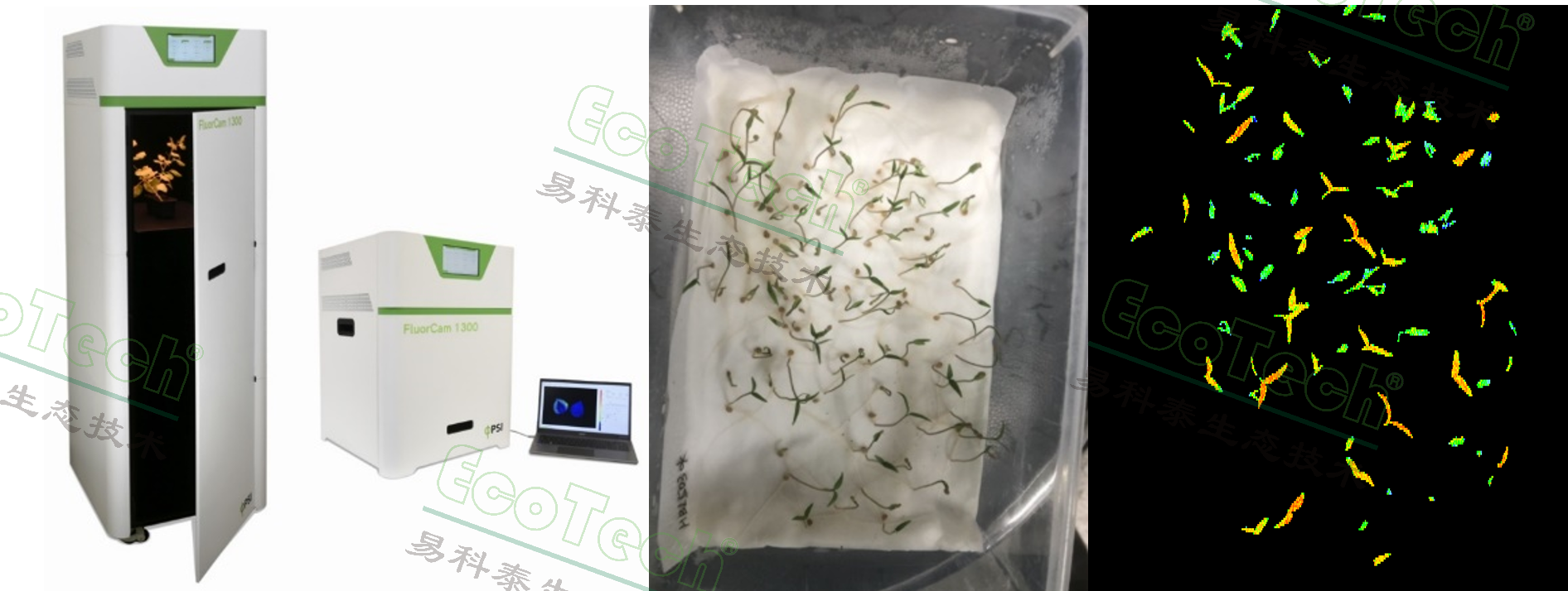 左图:新一代FluorCam1300多激发光多光谱荧光成像系统;右:利用FluorCam叶绿素荧光成像技术测量番茄种子萌发率并评估种苗活力