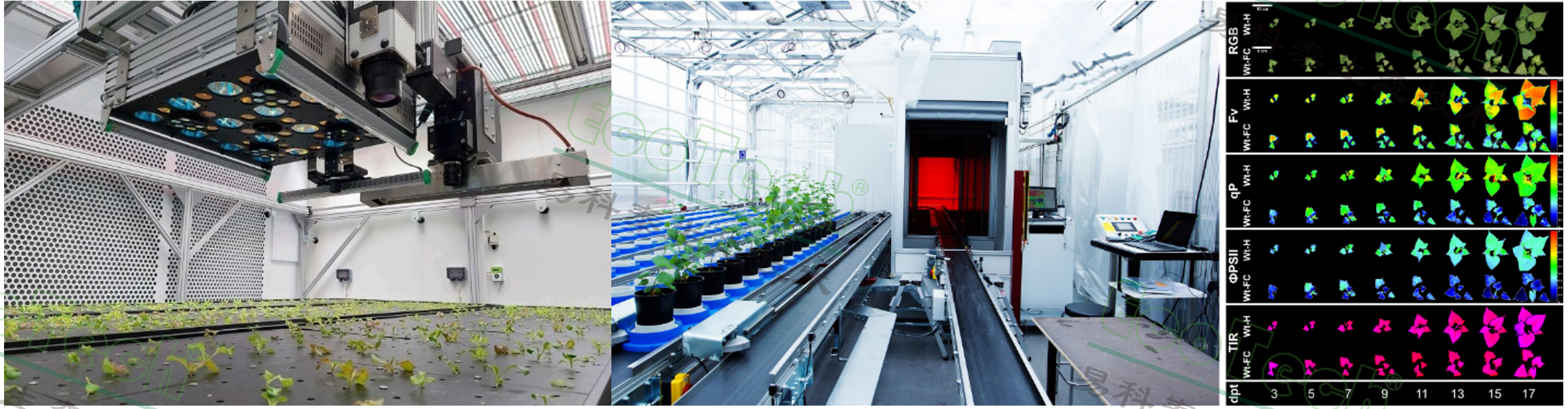 左图:荷兰瓦赫宁根大学PlantScreen XYZ三维移动式植物表型成像分析系统;中图:芬兰赫尔辛基大学PlantScreen传送带版高通量植物表型成像分析系统;右图:利用PlantScreen进行的甘薯高通量表型成像分析(Wang,2019)