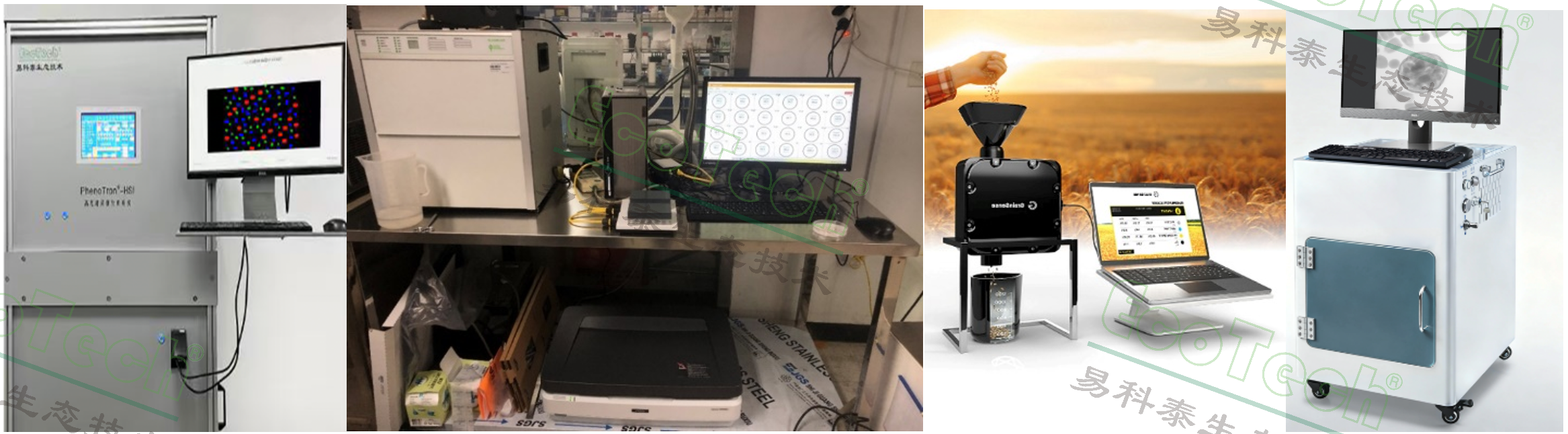 PhenoTron模块式表型成像分析技术的部分功能模块,从左至右分别为:FluorTron®多功能高光谱成像模块、种子呼吸检测与叶绿素荧光成像模块、Grainsense谷物成分分析模块、X-ray成像模块