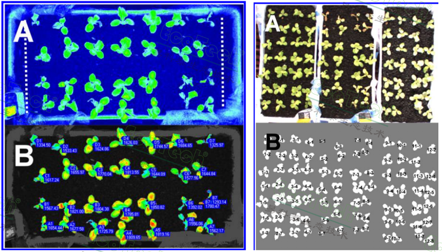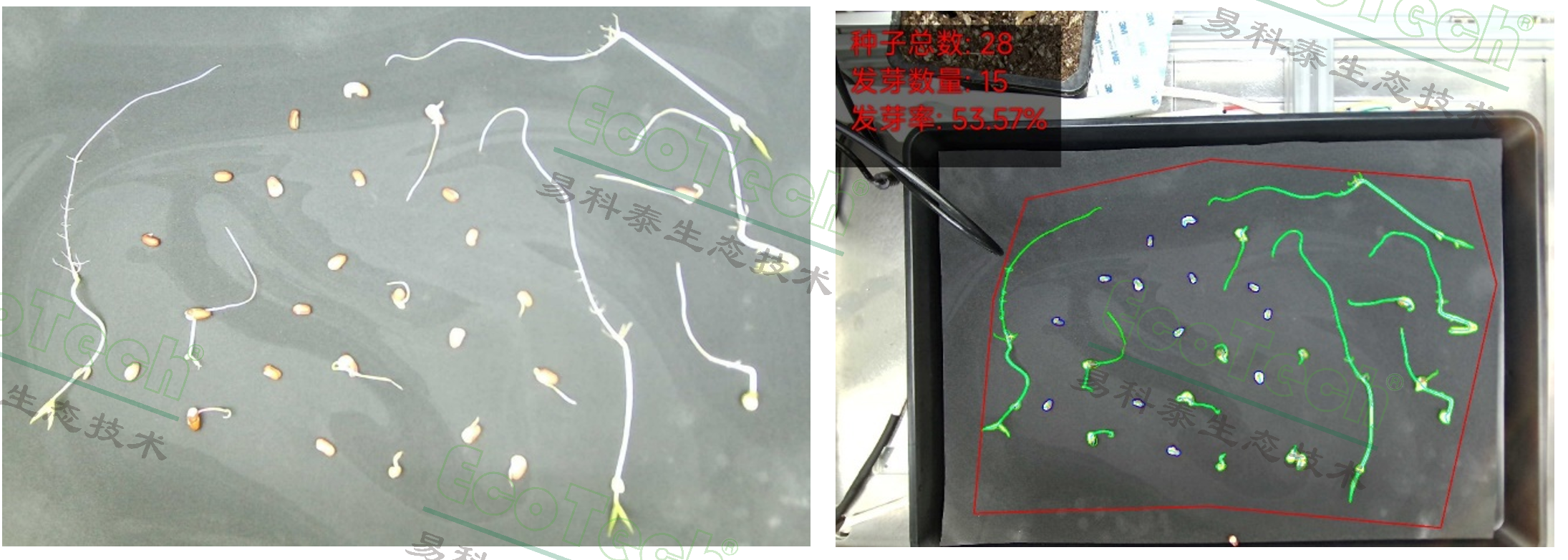 左图:顶视种子RGB图;右图:种子数量精准识别、发芽率统计(EcoTech®实验室供图)