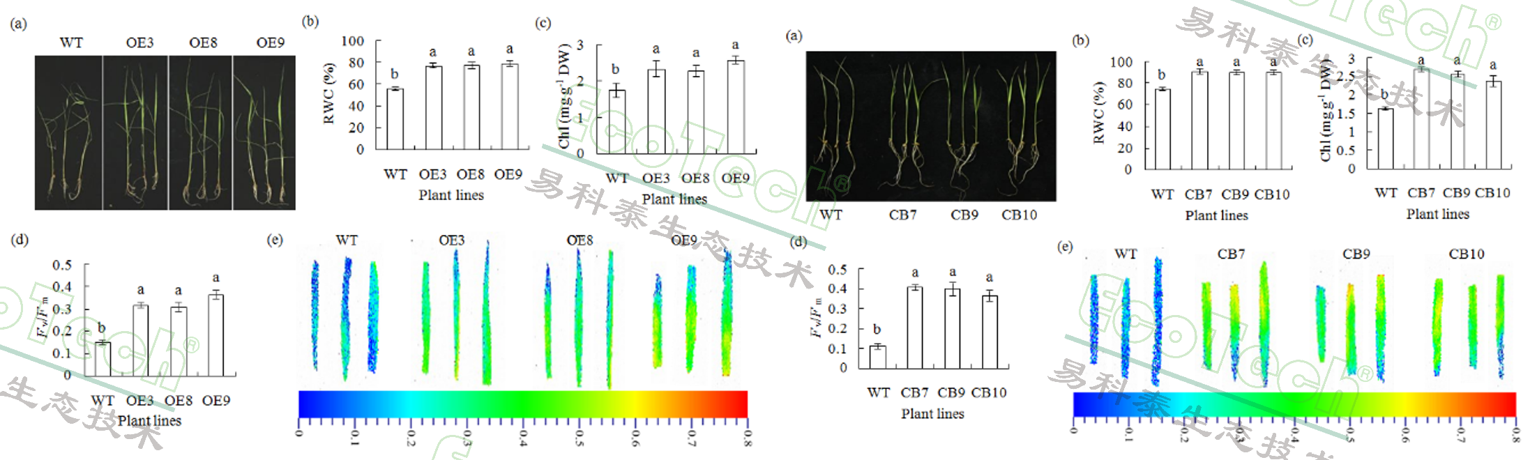 由此可见,叶绿素荧光成像技术是用于种子萌发与种苗活力检测的最佳技术之一。在很多研究中,只使用了叶绿素荧光成像技术来就能确定种苗的抗逆能力。比如华南农业大学通过转基因方法使水稻过表达两种抗逆基因CdtCIPK5和CdtCBL4,然后对转基因水稻幼苗进行盐胁迫、低温胁迫和干旱胁迫处理。通过FluorCam叶绿素荧光成像系统测量的最大光化学效率Fv/Fm证明,CdtCIPK5和CdtCBL4过表达提高了水稻的盐胁迫抗性,但对低温和干旱胁迫则没有显著作用。