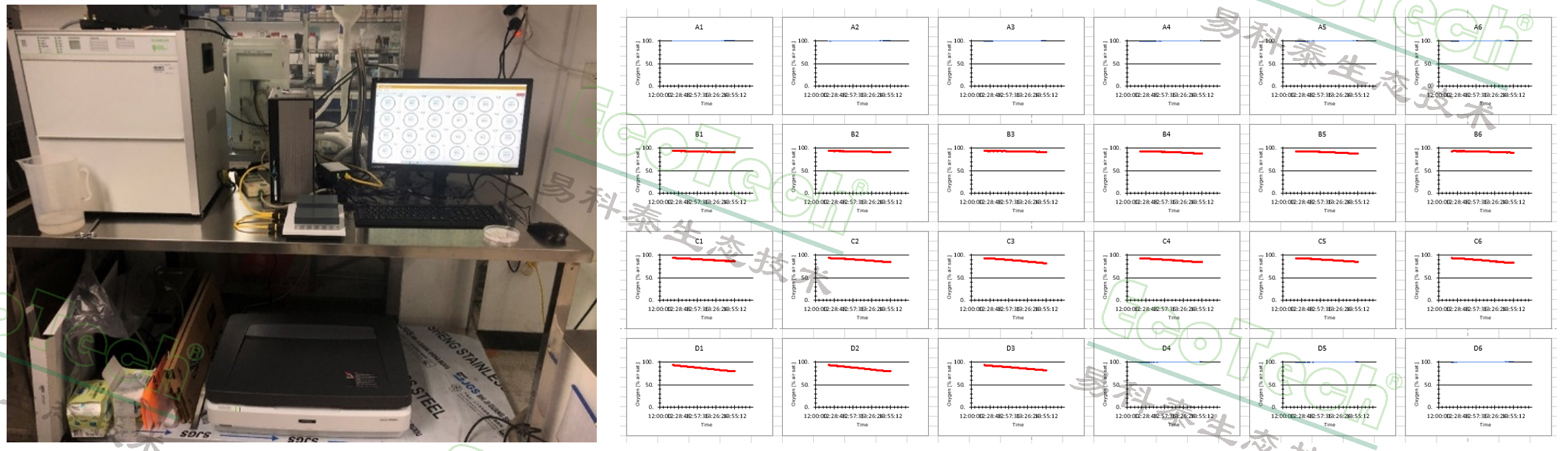 左图:配套高通量种子呼吸及活力检测系统交付农业农村部蔬菜种子质量监督检验测试中心;右图:24通道的种子耗氧曲线(蓝色曲线为空白对照,红色曲线为不同处理的测试种子)