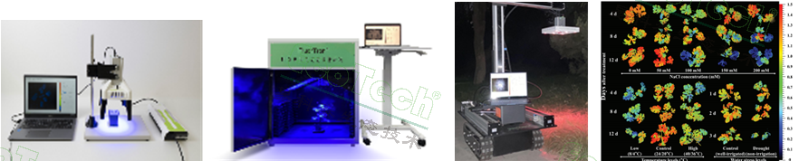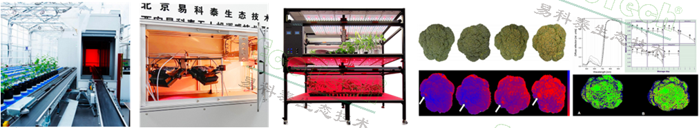 从左往右依次为:PlantScreen植物表型成像分析平台;PhenoTron®PTS一站式植物表型成像分析系统;PhenoTron®智能LED光源培养与表型分析平台; 花菜采后品质和新鲜度变化(左:采摘后10℃储存RGB及Fv/Fm成像图;右:采摘后16℃储存 反射光谱、NDVI数据及成像图)