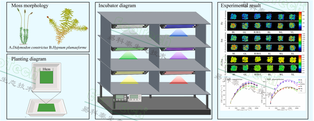 贵州大学林学院Meixuan Xie等人(2024年)通过实施各种LED光质培养,并分析尖叶对齿藓(Didymodon constrictus)和大灰藓(Hypnum plumaeforme)的生长生理和叶绿素荧光动力学(FluorCam叶绿素荧光成像系统由北京易科泰提供),探索这两种苔藓对不同光质的响应,研究结果为LED光源在这两种苔藓的人工栽培及其生理适应性中的应用提供了理论参考。