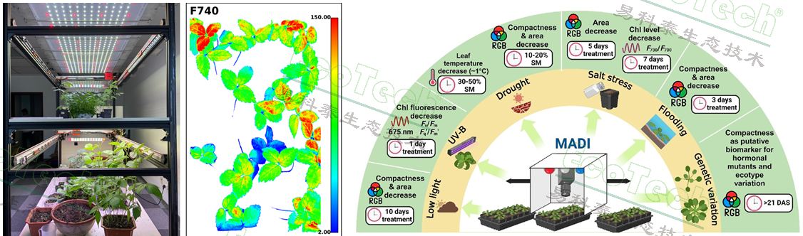 左图:PhenoTron®智能 LED 光源培养与表型分析平台;中图:西洋参诱变育种叶绿素荧光成像(EcoTech®实验室);右图引自 Thomas Depaepe 等(Plant Phenomics, 2025)