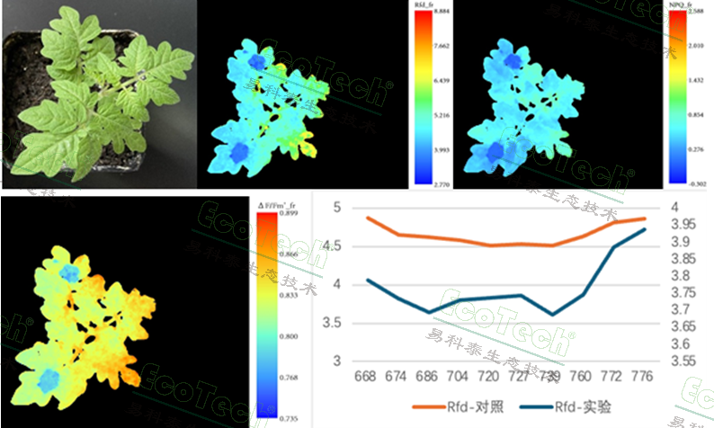 上图自左至右依次为:DCMU处理后的番茄苗、Rfd、NPQ;下左图为有效光量子产量YPSII(∆F/Fm’),下右图为施药区域(荧光参数图中2个深蓝色斑点区域,选取旁边同等大小区域作为对照区域)及对照区域的Rfd光谱响应