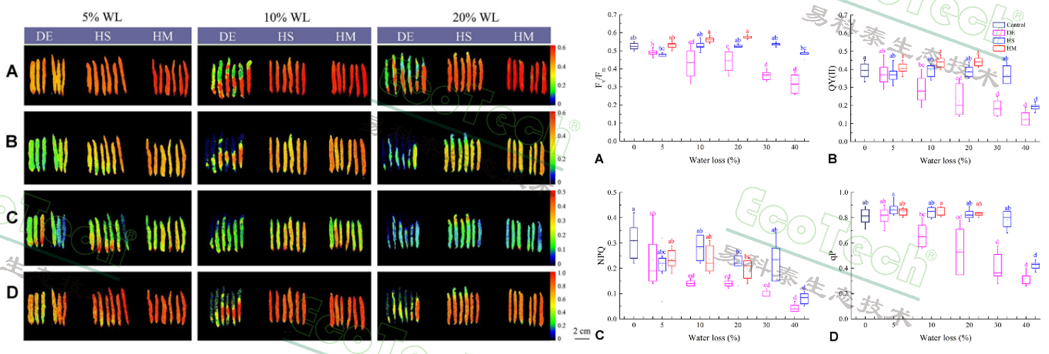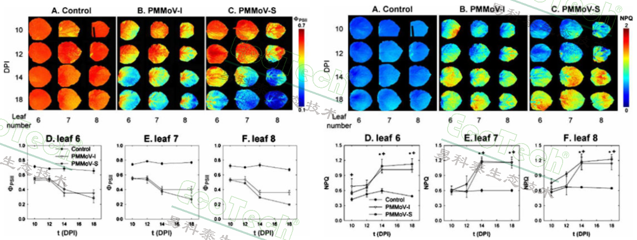 辣椒轻斑驳病毒(PMMoV)感染本氏烟草后,会导致其光合作用变化,如光系统 II(PSII)受抑制、光合电子传递链和卡尔文循环相关叶绿体蛋白下调、ATP/NADPH 同化潜力失衡等。本研究利用FluorCam叶绿素荧光成像仪分析生物胁迫下的光合作用和次生代谢激活,实现了症状出现前的胁迫检测 (ΦPSII值下降),同时提供了病原体在寄主植物中迁移的关键信息。