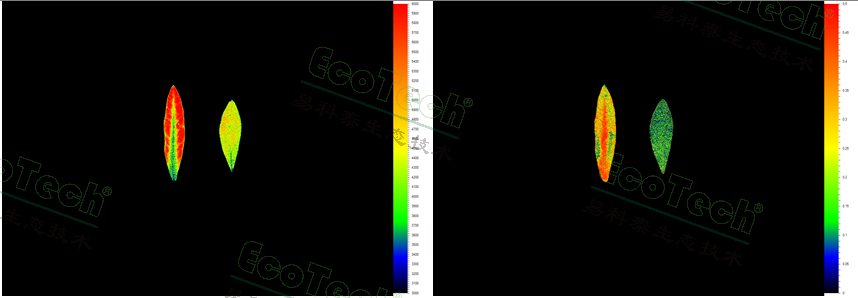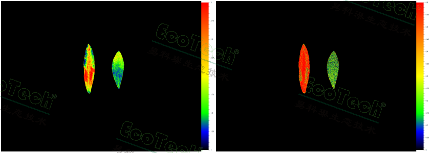 叶绿素荧光成像:(左)Fo最小荧光及(右)QY Lss稳态光量子效率
