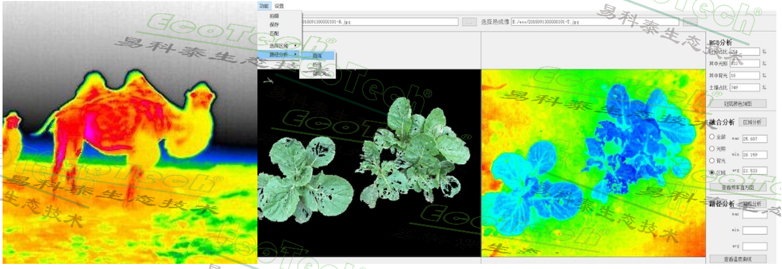 Thermo-RGB一体式红外热成像仪采用易科泰研发的红外热成像与RGB 成像融合分析技术,可实时精准 ROI 分区分析和图像分割,广泛应用于植物表型分析、植物干旱胁迫检测与抗性筛选等,及动物形态体温生理变化,非接触非损伤检测动物健康与形态测量。