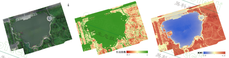 左图:人工湖及周边RGB图,反映地物空间分布;中图:红边比值指数,突出显示绿色植被内部的差异;右图:归一化差异水体指数NDWI(易科泰光谱成像与无人机遥感技术研究中心供图)