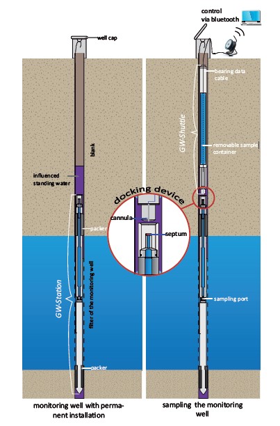 由于地下水垂直流的作用,通过传统的分层方法,不能取得理想的水样。穿梭式地下水取样器可以将取样管长期深埋于地下,这样能阻止水柱中垂直流以及物质运输对水样中化学组成的影响,然后将水样过滤到取样器中,最终通过电脑控制取样管,获得原态水样。