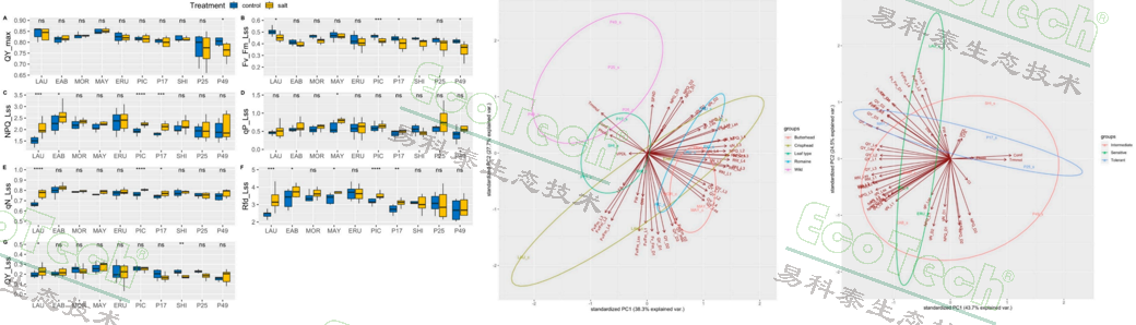 图1. 左图:不同基因型生菜样品对盐胁迫响应的叶绿素荧光参数变化;中图:不同生菜类型的 PCA 分析图;右图:盐胁迫下基因型 PCA 分析图;