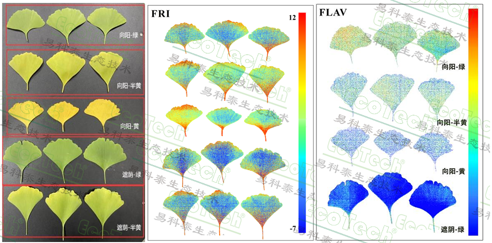 从左至右依次为:银杏叶RGB图、黄酮反射指数FRI、黄酮指数FLAV