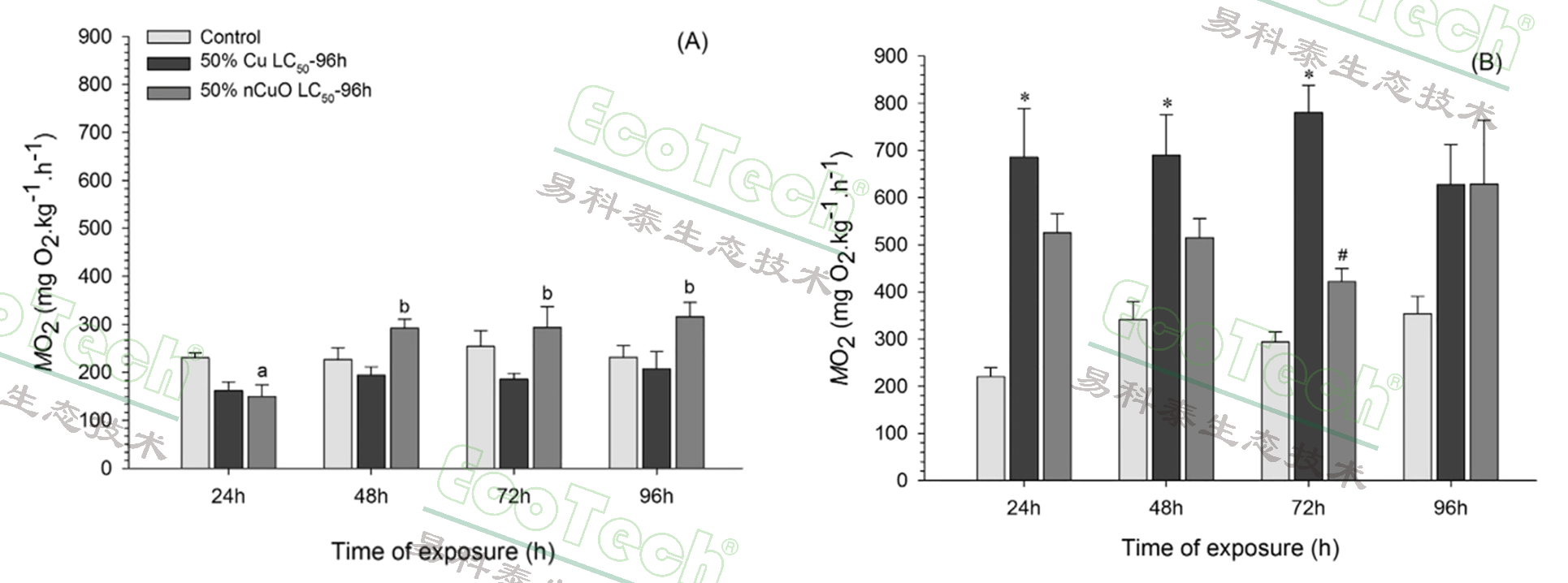 七彩短鲷(A)和宝莲灯鱼(B)在暴露于 50% 铜96小时半数致死浓度、50%氧化铜纳米颗粒96小时半数致死浓度及空白对照组24、48、72和96小时后的耗氧率(MO2)