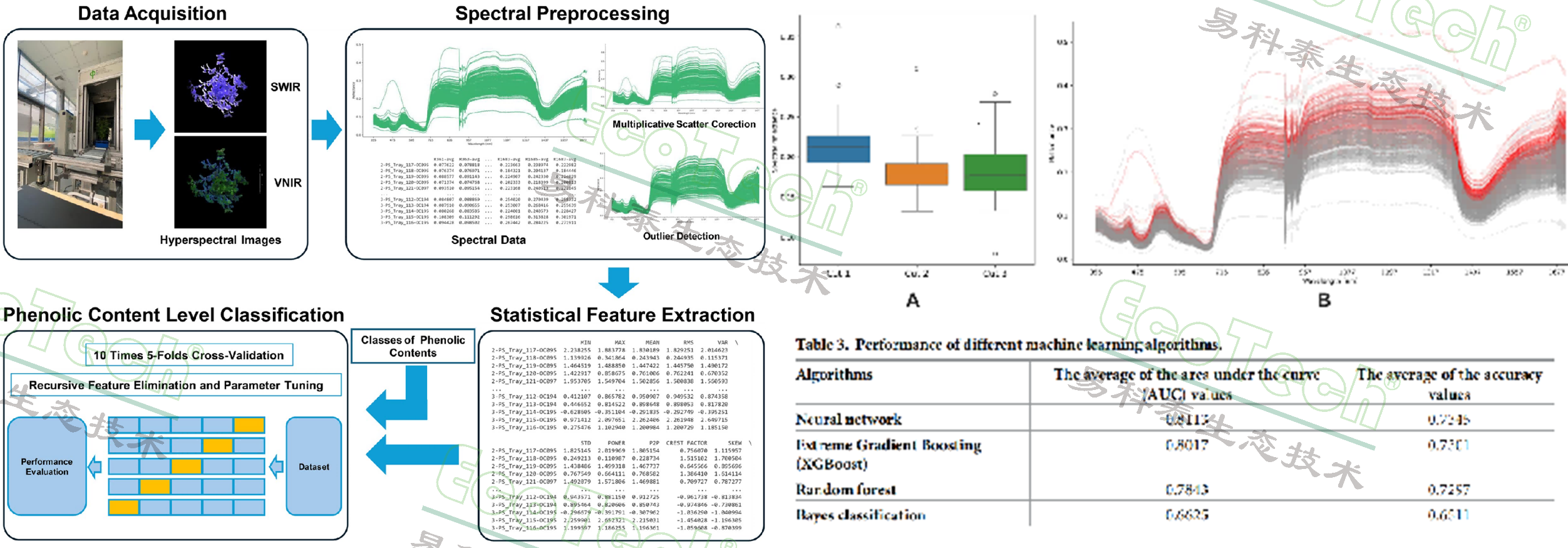 得益于系统自动化、高通量的优势,对26个圣罗勒品种,分3个生育期(cut1、2、3)在可见近红外(VNIR :355–900 nm)和短波红外(SWIR:900–1700 nm)光谱范围内获取罗勒的高光谱图像数据。使用PlantScreen™数据分析软件对这些高光谱图像进行处理,包括图像转换处理、提取光谱信息、图像分割、光谱统计、2nm间隔降维等,输出单株平均光谱。之后经过提取特征参数、剔除异常数据、测量总酚含量、建模等步骤,开发并评估用于表征酚类物质含量水平的机器学习模型