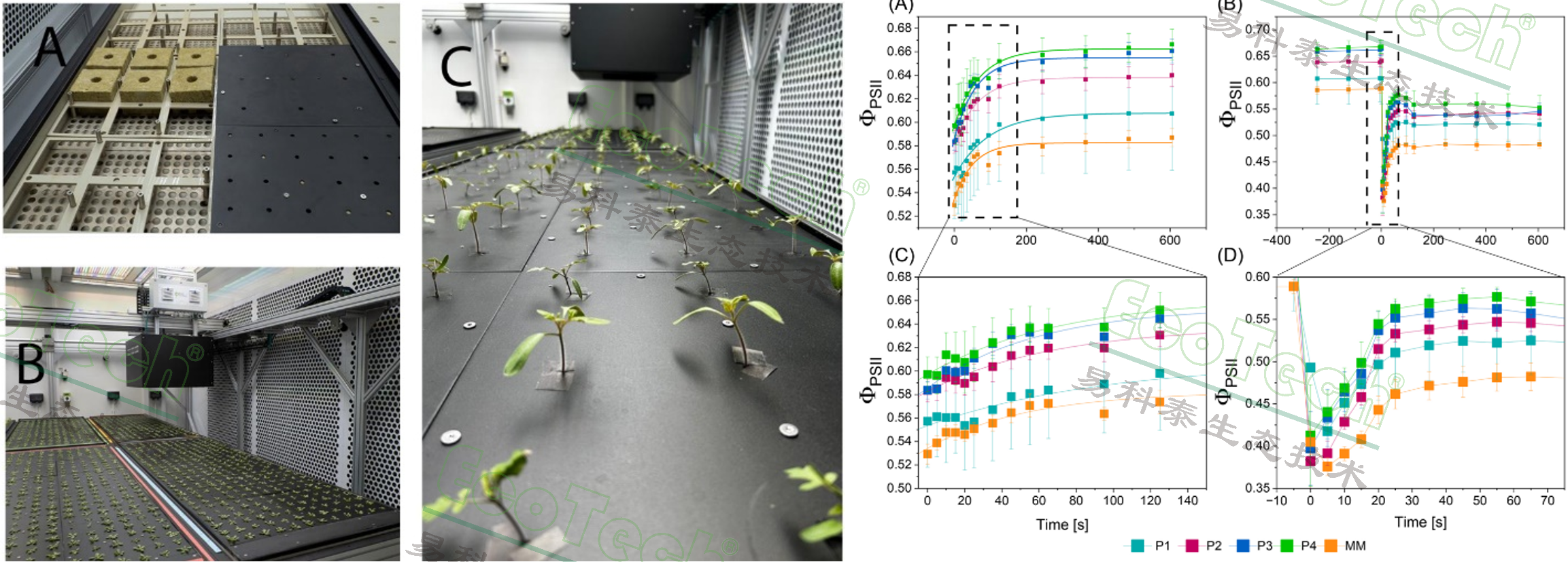 左图:实验中的PlantScreen XYZ三维移动式植物表型成像分析系统及配套的植物生长室、水培装置;右图:低温波动光照环境下的ΦPSII动力学曲线