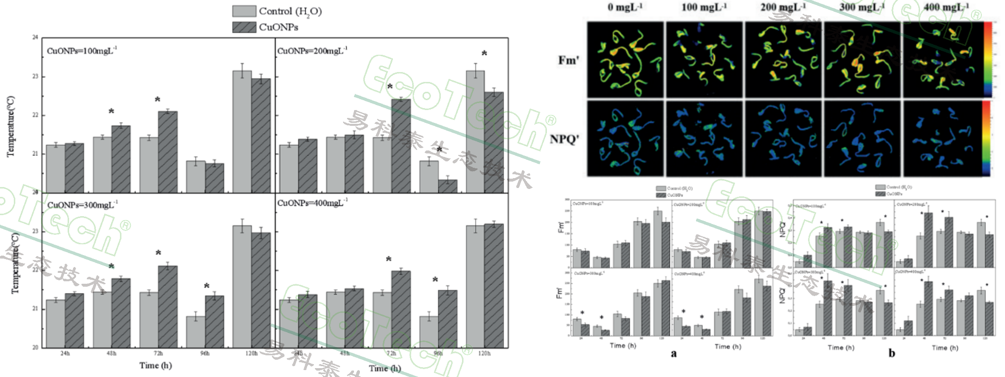 左图:不同浓度CuO纳米粒子处理种子的温度动态数据;右图:不同浓度CuO纳米粒子处理120h后的叶绿素荧光成像图与对应的动态数据