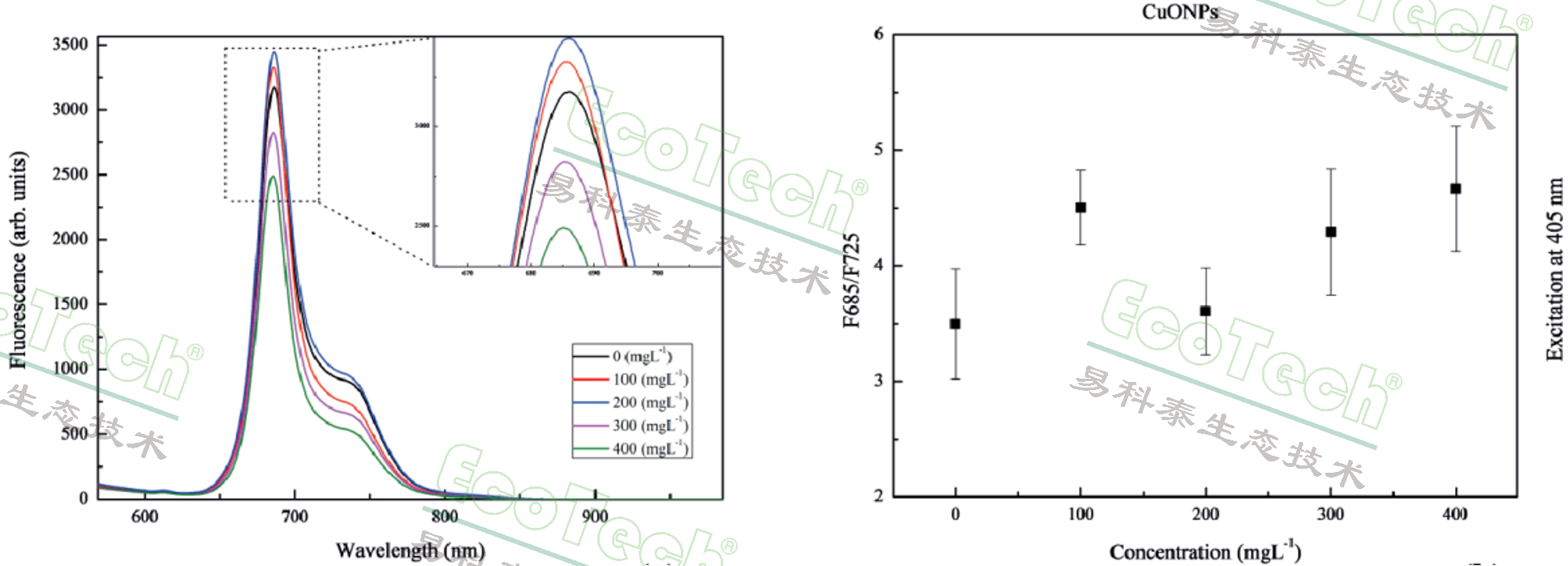 左图:不同浓度CuO纳米粒子处理120h后叶绿素荧光光谱曲线;右图:对应的F685/F735比值