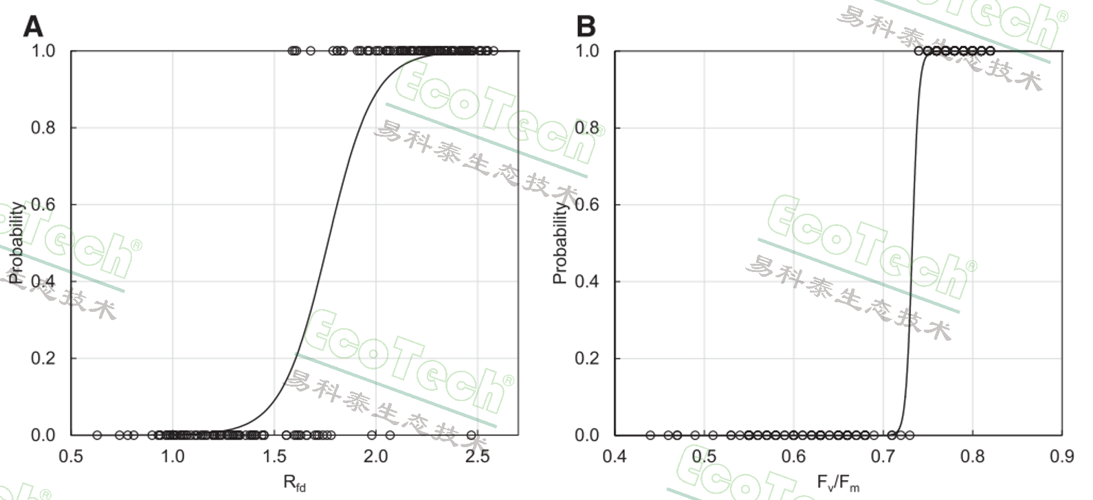 荧光衰减比率Rfd和最大光化学效率Fv/Fm的逻辑回归函数,概率1代表健康植株,概率0代表染病植株