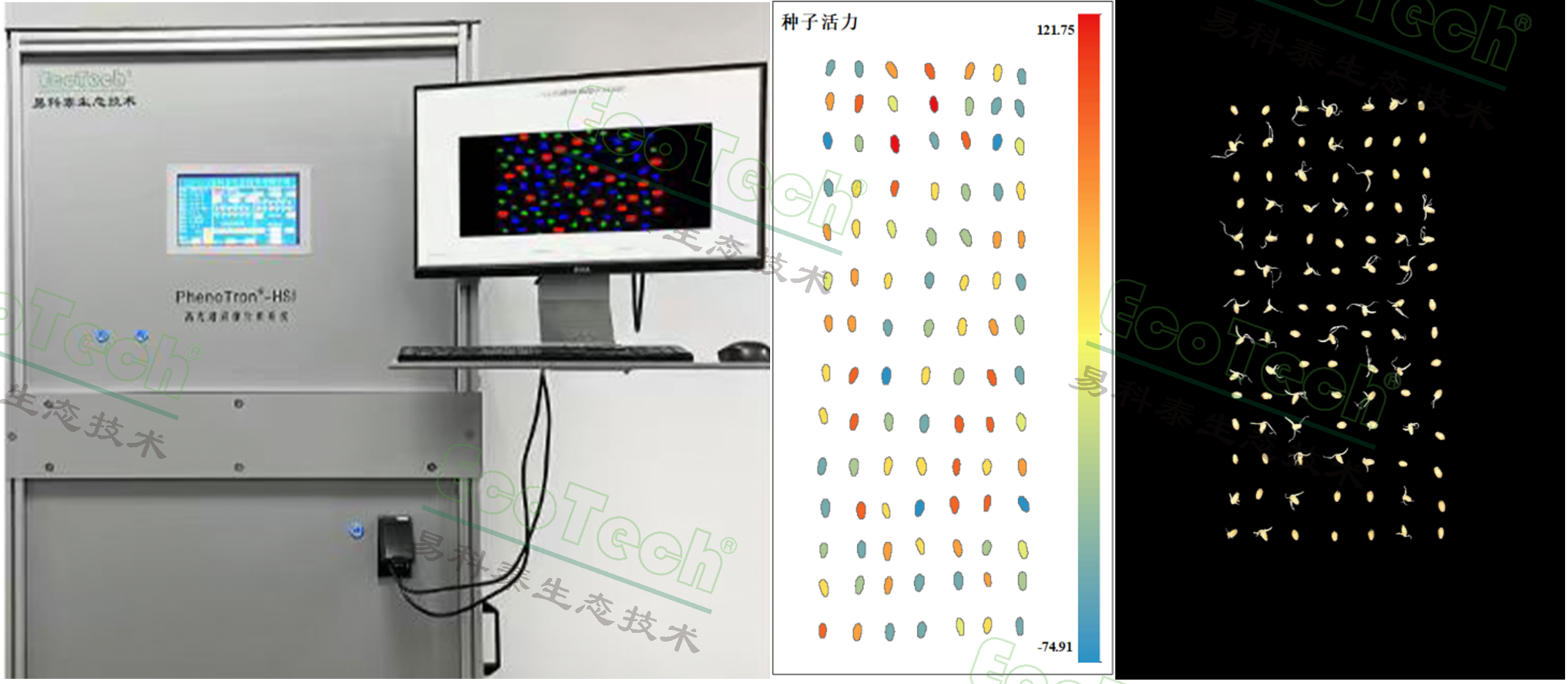 左图:多功能高光谱成像种质资源检测系统;中图:判断分析算法模型预测小麦种子活力;(红色为活力高,蓝色为老化处理失活种子);右图:小麦种子实际萌发情况(EcoTech®实验室供图)