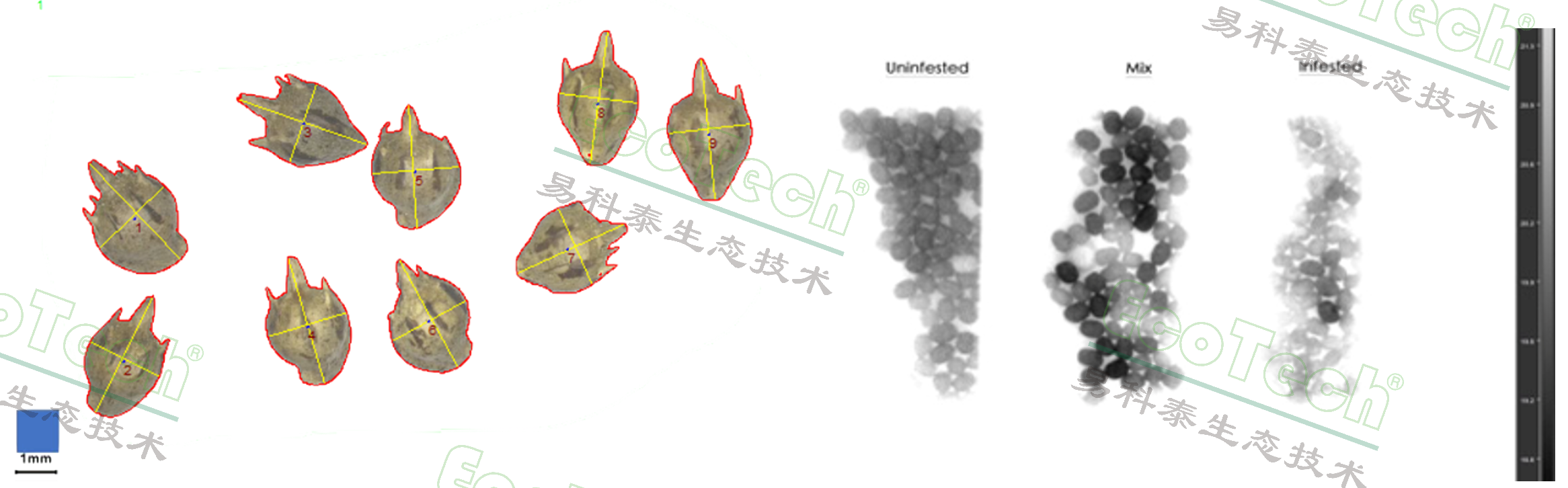 左图:紫花苜蓿种子形态分析(EcoTech®实验室供图)右图:绿豆豆象侵染检测(EcoTech®实验室供图)