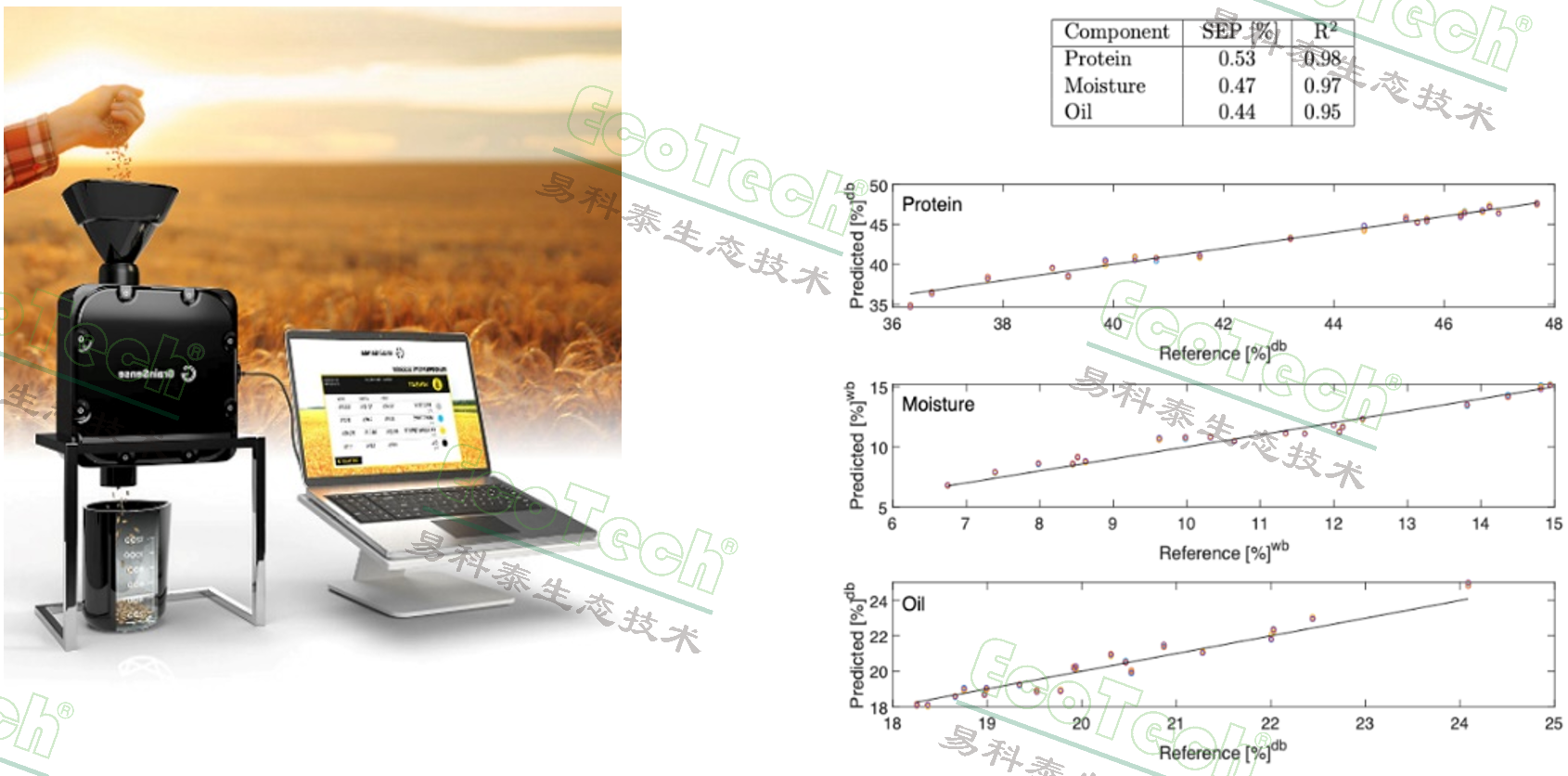 左图:台式种子成分分析仪;右图:大豆蛋白质、水分、脂肪含量预测值与真实值比对