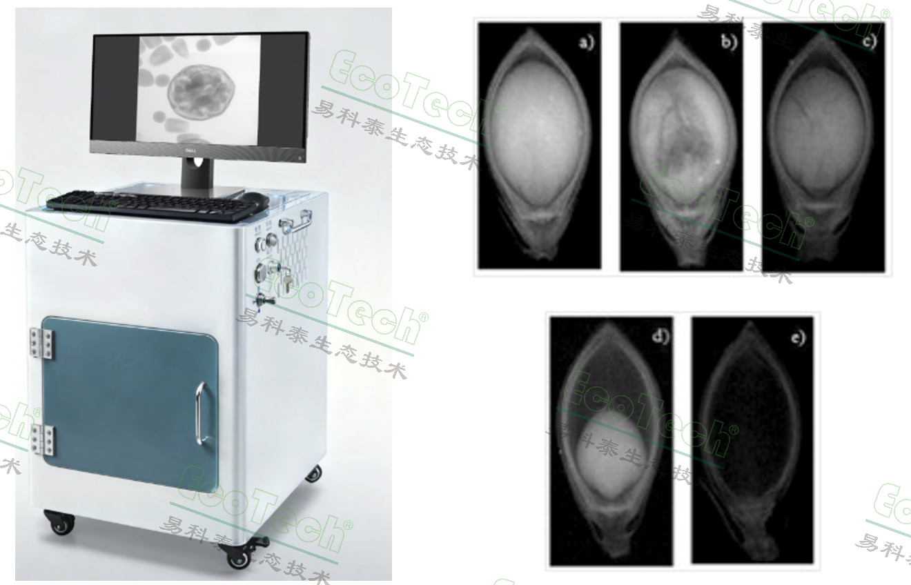 左图:种子X射线成像分析仪;右图:经X射线成像检测的信号草(一种牧草)种子:完整种子(a)、组织退化(b)、机械损伤(c)、畸形(d)及空壳颖(e)