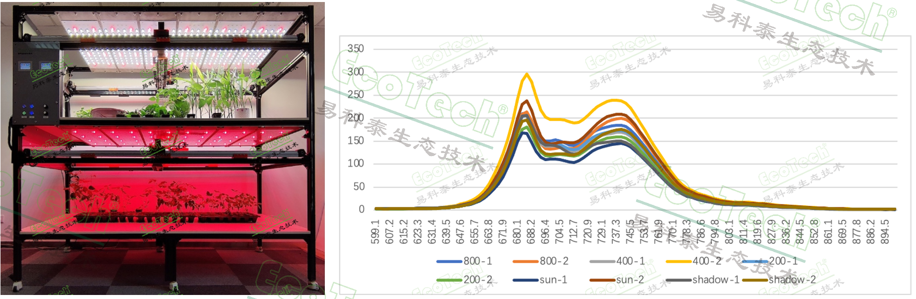 左图:PhenoTron 复式智能LED光源培养与表型成像在线监测系统;右图:不同光照条件培养的重楼叶绿素荧光光谱